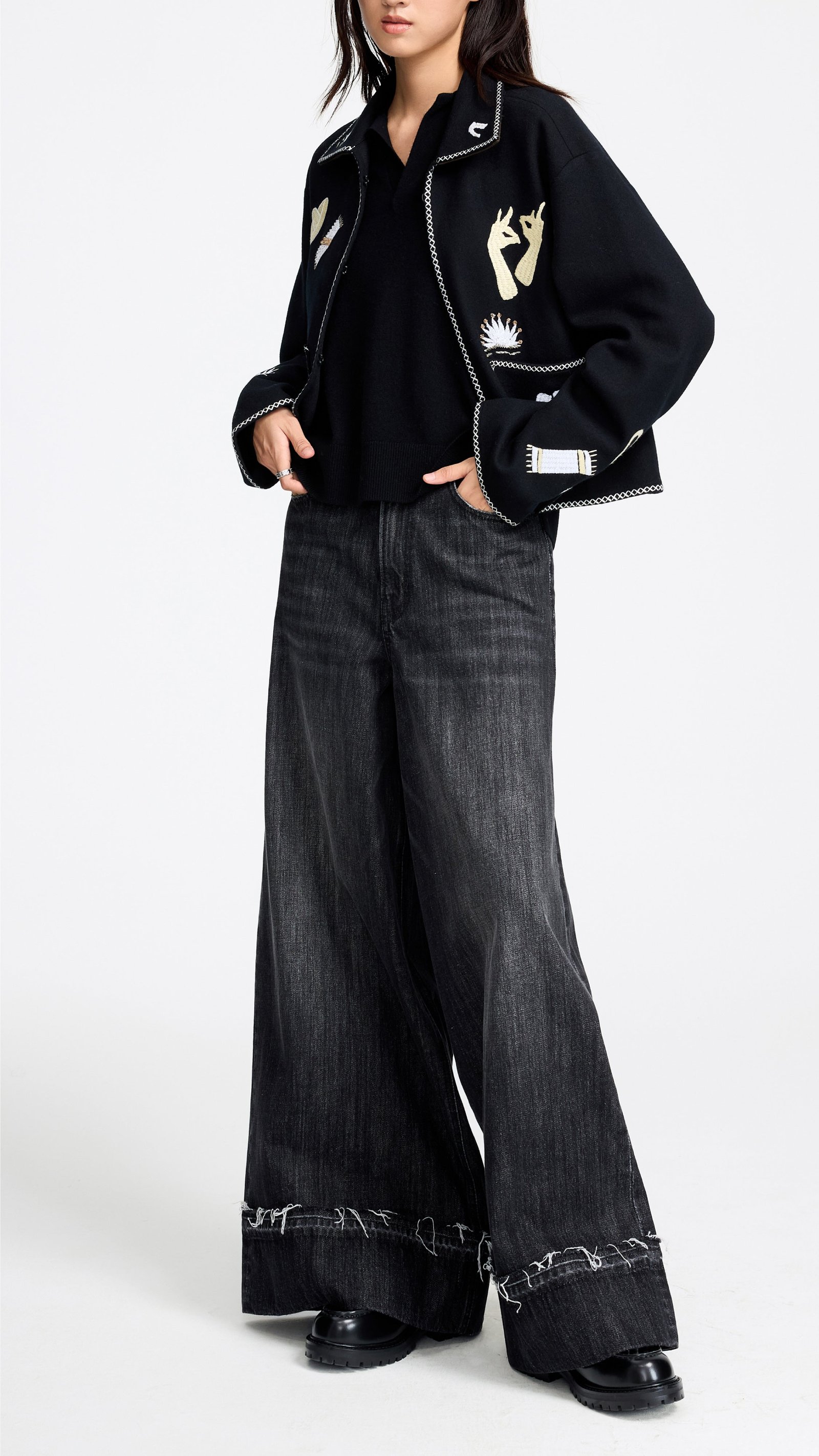 - Frayed edge at rolled cuffs